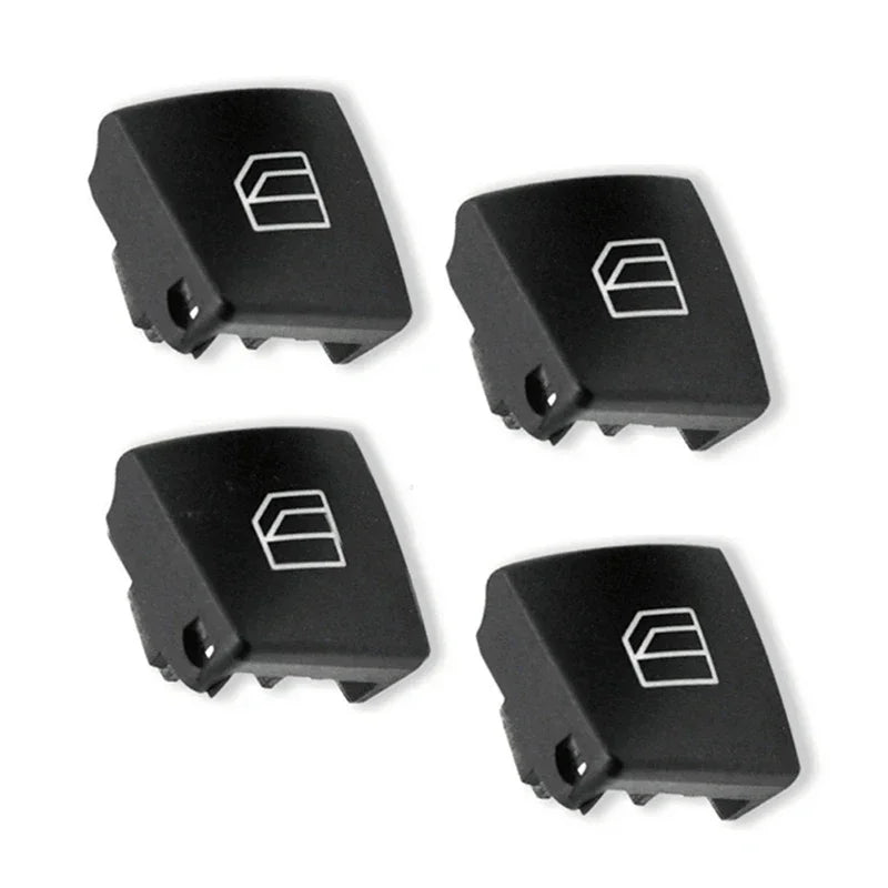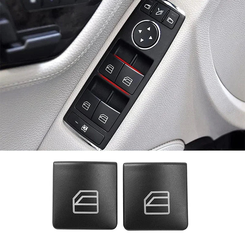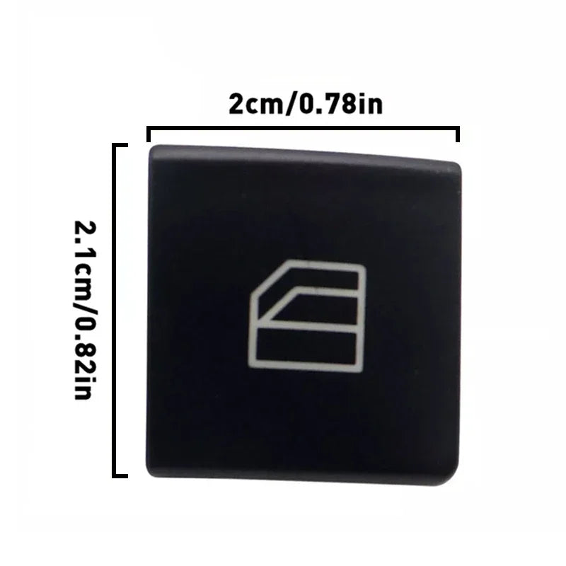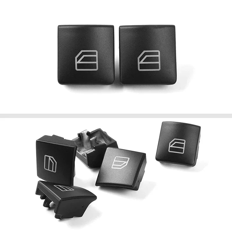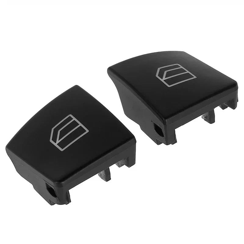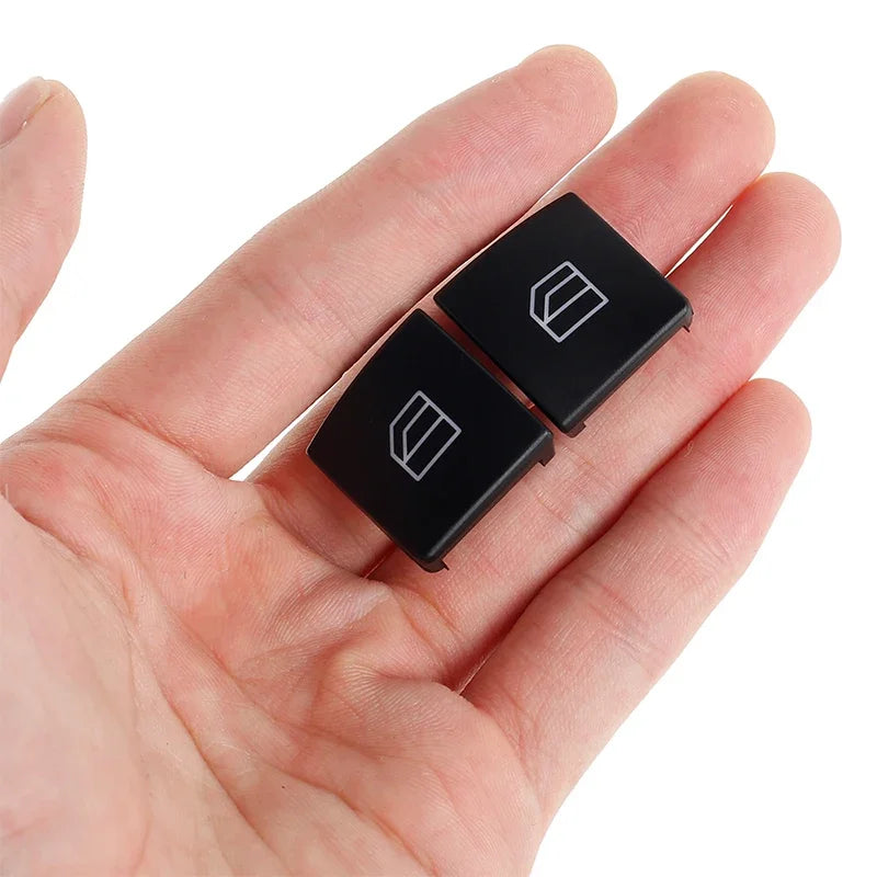 Zamensko dugme podizača prozora za Mercedes C‑Klasa W204 i E‑Klasa W212, prednja vrata. Dugmići za levu (vozač) i desnu (suvozač) stranu, identične spoljne dimenzije, različita orijentacija piktograma.